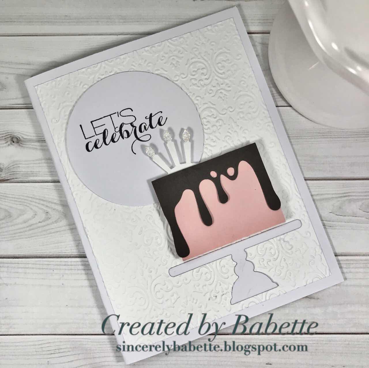 Cakes everywhere are decorated with a yummy layer of frosting dripping down the edges. I wanted my cake to have the same look! Kinda does, huh? 😋 I used the Tim Holtz, Drip Edge Thinlits along the top of a square piece of pink paper, I cut to fit my cake stand.