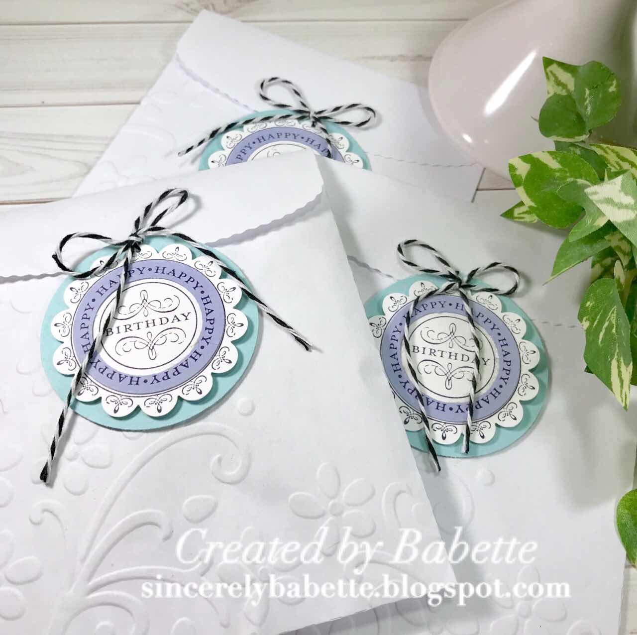 The embossed flowers on these bags give them a soft sophisticated look and the tags add whimsy. I created these bags with a die, but you can take a pre-made treat bag and emboss it with any embossing folder and add a tag.