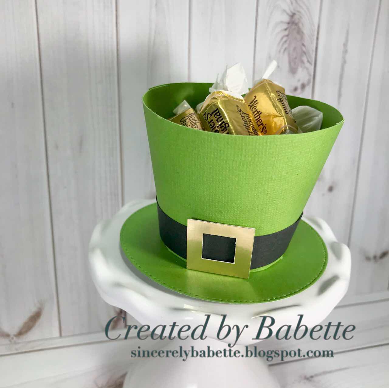 All I had to do was cut the handles off the Baskets and Blooms Bigz die by Stampin’ Up!, to start this project. It was the perfect beginning to a Leprechaun hat. Once I attached it to a 3.25” circle and added the band and buckle it was complete. It’s so dang cute! 💚