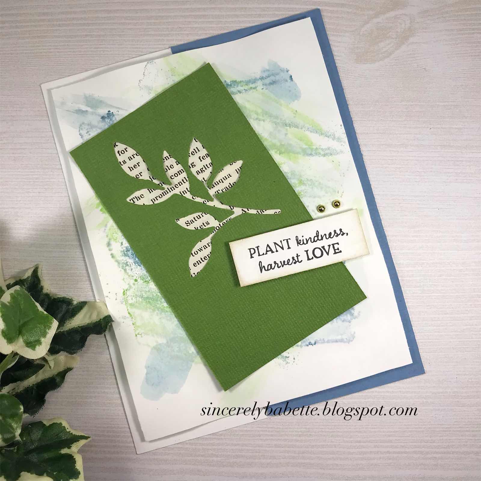 Have you tried water coloring? I used blue and green ink pads to create a watercolor background for this card. I die cut a leaf stem for another project and loved the look of the remaining piece of paper. I placed an old book page behind it and loved that too. 😊 The sentiment is from the Autumn Goodness bundle by Stampin’ Up!
