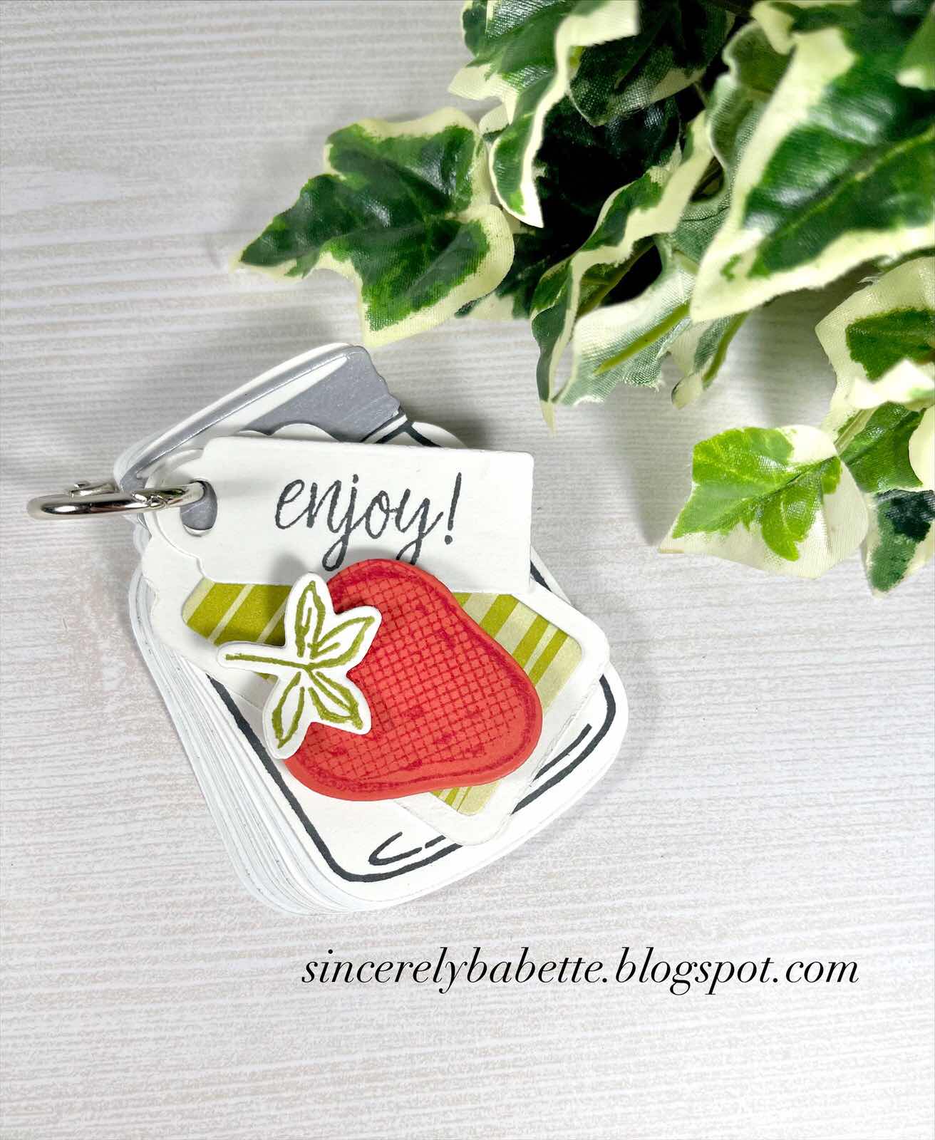This is such a fun little notepad. I used a jar die to cut several jars from printer paper, then punched a hole through each one and attached them with a binder ring. The strawberry tag made an adorable addition.