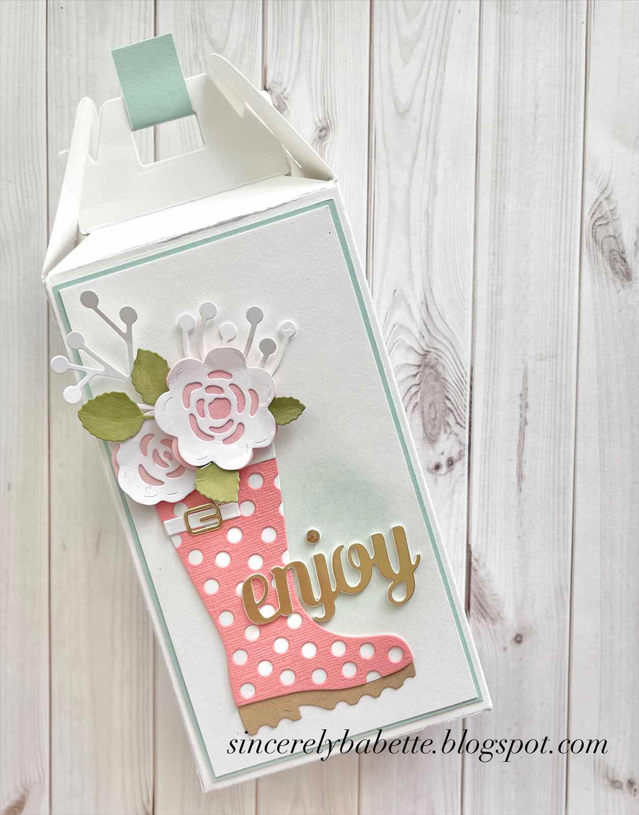 Isn’t this Rain Boot die by KSCraft the sweetest?! I placed a few flowers and stems from the Spring Floral dies by A Pocket Full of Happiness inside and a sentiment on top, before attaching it to a die cut gable box.