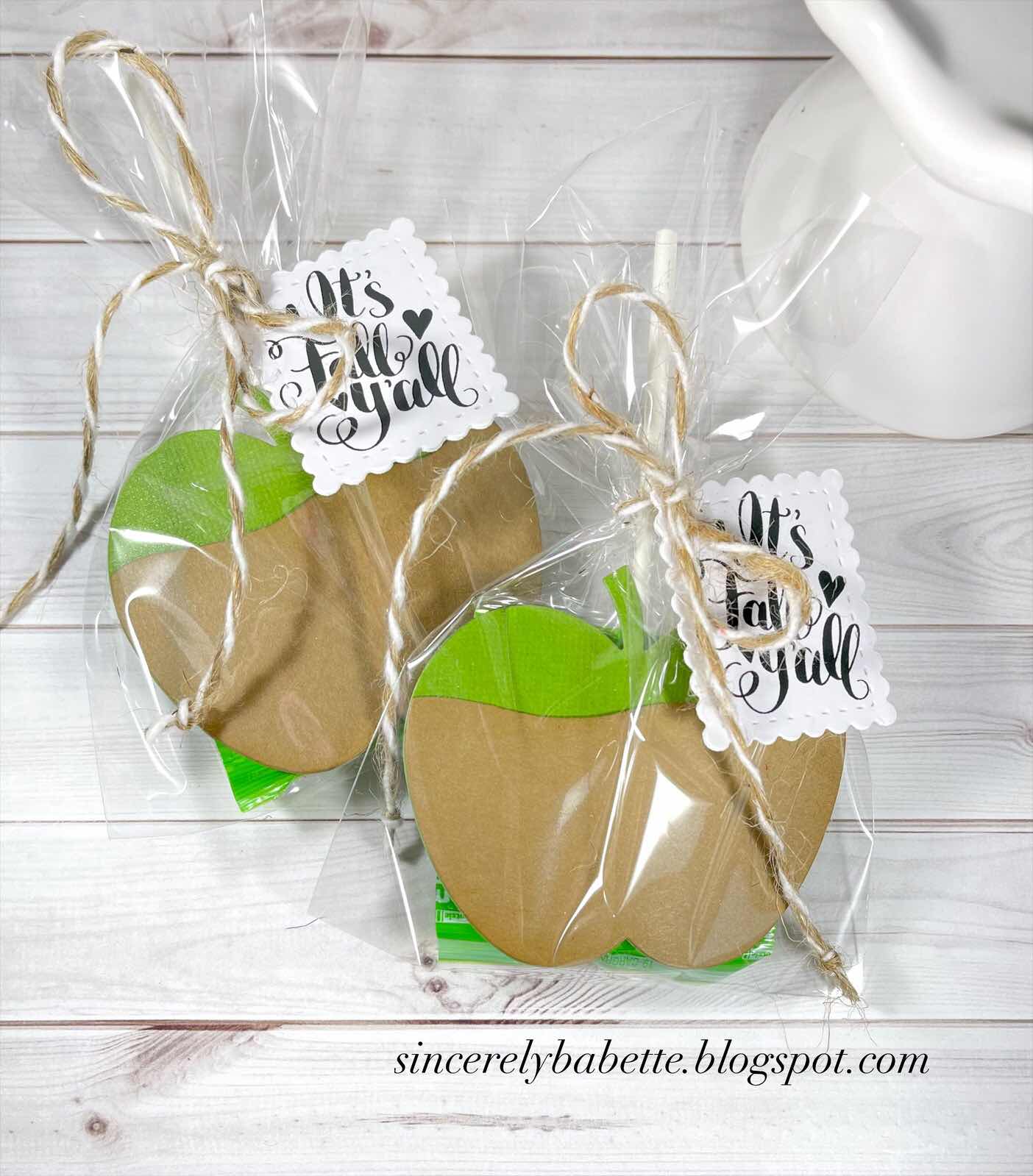 Here’s a cute treat you can gift for Fall or Halloween! I used the Apple Orchard dies by Concord & 9th. To create the caramel, I die cut the apple from Kraft cardstock, then cut it with scissors to resemble melted caramel. I glued a Caramel Apple Pop between two apples, placed them in cello bags, tied each with twine, I found at dollar tree and attached an adorable sentiment by kimberdawnco.com. I love how these turned out. 😍
