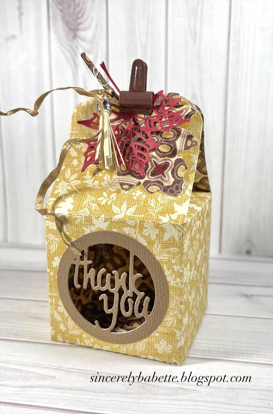 I took a fun, box die and turned it into a sweet Thanksgiving Favor. A couple of die cut leaves clipped to the top, adds charm and gives it a festive look. Not to mention the clip keeps the box closed.